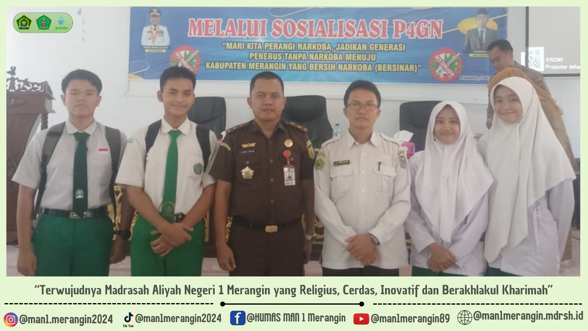 Merangin-Pencegahan penyalahgunaan dan peredaran Narkoba di Merangin terus dilakukan. Pencegahan dikemas dalam bentuk sosialisasi oleh pihak terkait dengan mengundang pelajar serta organisasi pemuda yang ada di dalam kabupaten Merangin. Salah satunya diikuti oleh adalah MAN 1 Merangin di aula Badan Kesbangpol Kabupaten Merangin pada hari selasa tanggal 29 Oktober 2024.
