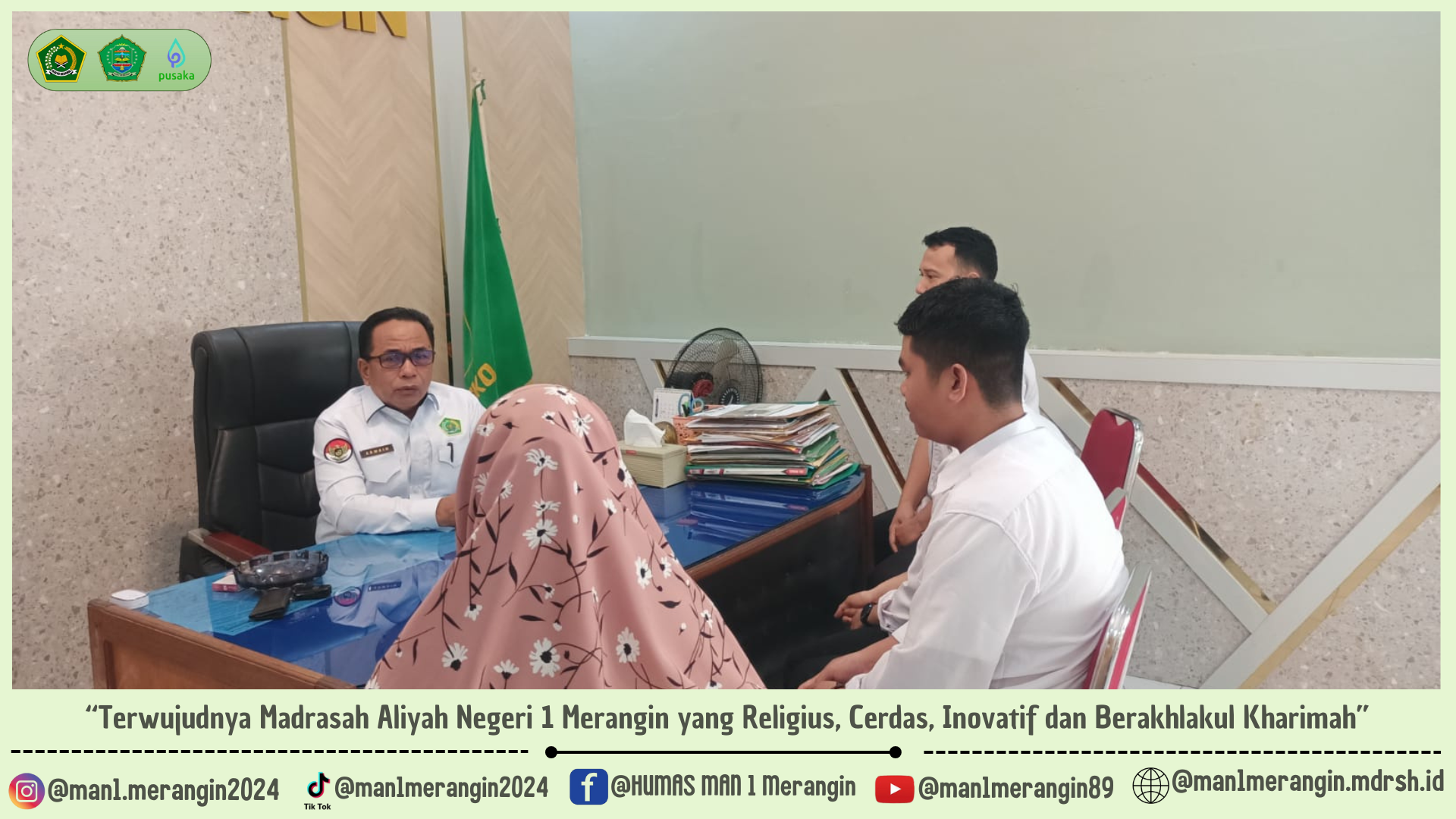 Merangin - Kepala Madrasah MAN 1 Merangin Armain, S.Ag, melaksanakan kegiatan pembinaan kepada staf Tata Usaha (TU) di ruang Kepala Madrasah pada hari Selasa, 19 November 2024. Kegiatan ini bertujuan untuk mengoptimalkan jam kerja staf TU serta mendiskusikan berbagai hal terkait peningkatan kualitas administrasi dan kinerja di lingkungan madrasah.