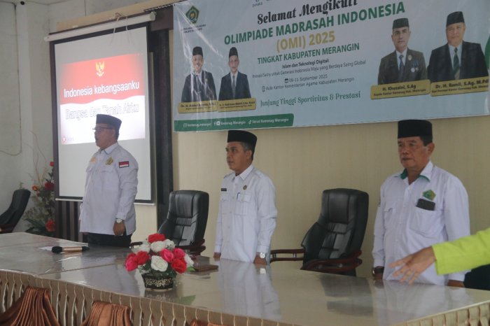 Merangin – Senin, 08 September 2025. 18 siswa MAN 1 Merangin yang menjadi peserta Olimpiade Madrasah Indonesia (OMI) cabang Sains mengikuti secara antusias pembukaan OMI tingkat Kabupaten Merangin. Kegiatan yang berlangsung khidmat ini dilaksanakan di Aula Haji kantor kementerian Agama Kabupaten Merangin dan dihadiri oleh Kasi Pendidikan Madrasah (Pemad) Kemenag Merangin serta Kepala Tata Usaha Kemenag Merangin.